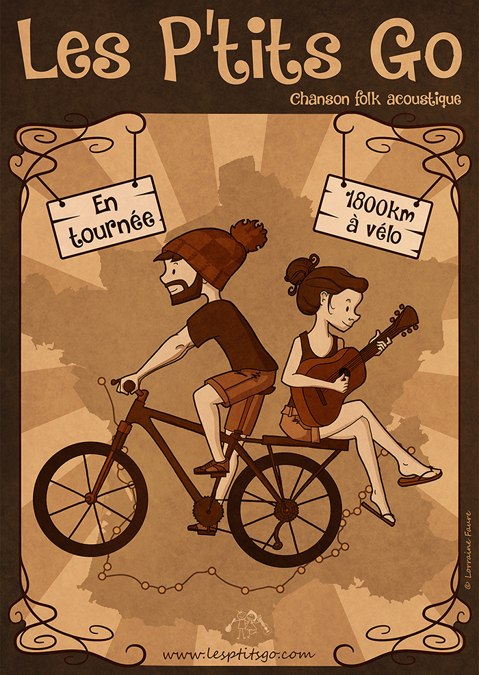Affiche de tournée musicale et en vélo d’un groupe de musique folk.